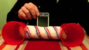 Menoja vain kaksi dollaria, ihminen rakentaa kotitekoisia kaiuttimet mobiili, kaksi muovista silmälasit ja roll maalaus.