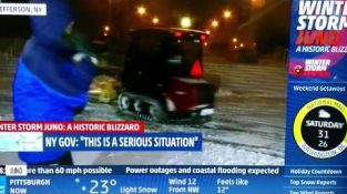 Weather Channel toimittaja video pommitettiin lumiaura kuljettaja tekee donitseja.