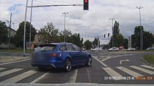 Huolimaton kuljettaja Audi RS6 kaupungin Poznan, Puola, kulkee punainen ja törmää kulkee raitiovaunu. Karma beat.