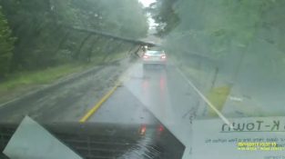 Puu kaatuu auton ja aiheuttaa onnettomuuden