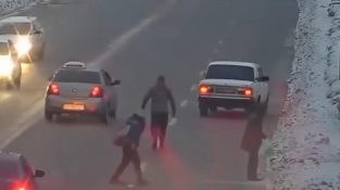 Opas kaupunkiin Ntinpro Ukraina, hyökkää jalankulkijoita ylittämässä tietä alitajuisesti.