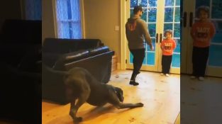 Koira jäljittelee pomo kävelee tekevät suuria harppauksia talossa olohuoneessa.