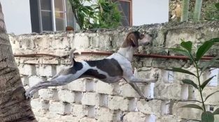 Molemmat jalat puiden ja kaksi muuta seinälle, koira tekee hauska akrobaattisia haluavat näyttää pihalla talon.