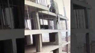 Työntekijä katolla rakennuksen poistaa puinen konkreettisen muodon, kun ilma kuljettaa mukanaan puu-, työntämällä työntekijä vakuumissa. viime hetken, mies tulee pyytämien betoverga ja säästä [...]