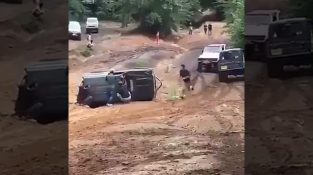 Mies yrittää auttaa palauttamaan jeeppi kaatuminen. Kiitos Superman, Te pakotti meidät.