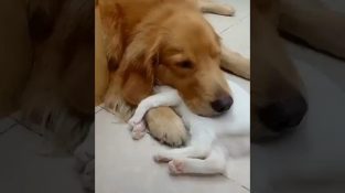 Kissa ja koira nukkuvat toistensa sylissä ja leikkivät yhdessä.