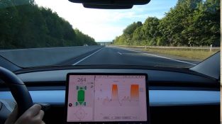 Autobahn-moottoritiellä Saksassa, kuljettaja testaa Tesla Model 3: n kiihtyvyyden, saavuttaa 254 km/h. Näyttö on asetettu 'track'-tilaan ilmaisemaan mahdollista akun lämpötilan nousua. [...]