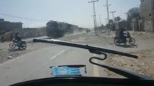 Pakistanin moottoripyöräilijä jättää huomiotta ohi kulkevan junan, ja yrittää ylittää kiskot niin nopeasti kuin pystyy.