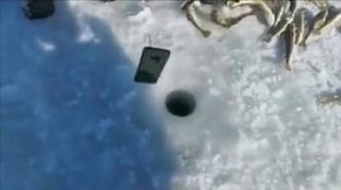 Kaksi venäläistä käyttää älykästä tekniikkaa tarkistaakseen kalat jäästä. Linjalla he laskevat matkapuhelimen pinnan alle, kun he ovat ottaneet videon sieppauksen käyttöön.