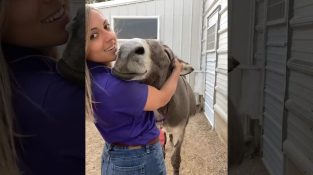 Longhopes Donkey Shelterissä Coloradossa, USA, aasi on naisen käsissä, joka hyväilee ja suutelee häntä.
