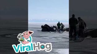 Kuorma rikkoo jäätä jäätyneessä järvessä ja uppoaa Listvyankassa, Venäjä