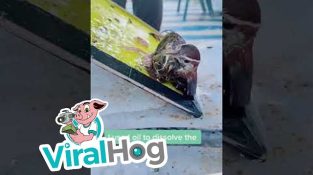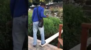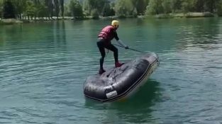 Humalassa mies yrittää päästä pois kelluvalta alustalta, painamalla puulevyä. Hallinnoi;