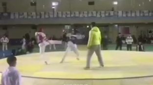 Taekwondo-ottelun aikana, urheilija tekee vaikuttavan kolmoiskierroksen ilmassa ennen kuin lyö vastustajaansa voimakkaalla potkulla.