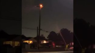 Yhdysvallat, Palomies yrittää sammuttaa sähköpylvään oikosulun aiheuttamaa tulipaloa, vesiletkun kanssa. Huono idea.
