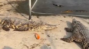 Kohtauksessa, joka näyttää siltä kuin se olisi tullut sarjakuvasta, krokotiili yrittää saada kiinni kalan, jonka joku on heittänyt sen kuoreen.