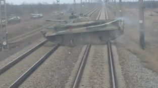 Rivi venäläisiä tankkeja ohittaa junan edestä lähellä Novooleksiivkaa, kaupunki Ukrainan Khersonin alueella. Junankuljettaja joutuu pysähtymään törmäyksen välttämiseksi.