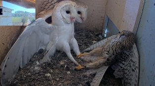 Pieni haukka (kirkinezi) hyökkää pöllöparin pesään, mutta pöllöt hyökkäävät vastahyökkäykseen, pakottaa haukan lähtemään peloissaan.