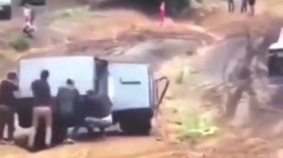 Neljä miestä korjaa kaatuneen 4×4 epätasaisessa maastossa. Hanke päättyy jokseenkin häpeällisesti.