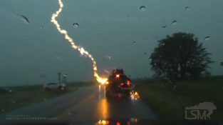 Myrskyn aikana Kansasissa, ukkonen törmää liikkeellä olevaan maastoautoon. Perhe, jossa oli kaksi pientä lasta, oli autossa, ja kaikki pakenivat vahingoittumattomina.