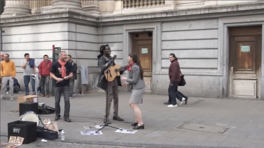 à Bruxelles, un musicien ambulant joue « Trois petits oiseaux » de Bob Marley., tandis qu'une femme qui passe avec une belle voix prend le courage de l'accompagner.