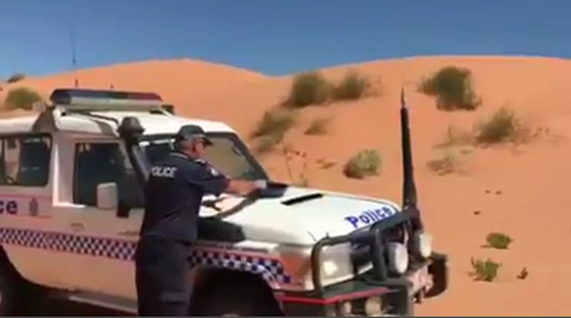 Un policier frire un oeuf avec la chaleur du soleil sur le capot d'une patrouille, le désert de Simpson près de Birdsville Australie.