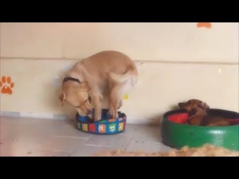 Un labrador essayant avec beaucoup d'effort pour tenir dans le lit d'un petit chien, sans succès. Le petit chien qui a volé son lit labrador, surveiller confortablement couché.