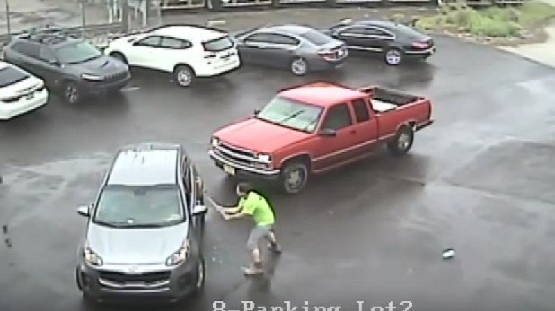 Hier après-midi, une caméra de sécurité a enregistré l'agression d'un conducteur dans le parking, Port quartier Richmond à Philadelphie, Pennsylvanie. Pour une raison inconnue, un homme est sorti d'une camionnette avec un grand marteau de forgeron pour frapper une fenêtre de voiture Kia et carrosserie. Alors que le conducteur de la Kia quittait, le passager est tombé de la voiture et a dû attendre la sortie de la zone de stationnement. Le délinquant a saisi l'occasion de frapper l'homme et de briser la vitre arrière du véhicule.