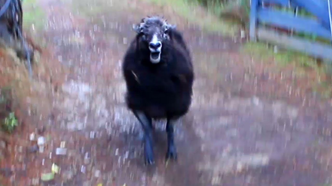 Une femme en Nouvelle-Zélande près d'une ferme, quand soudain est attaqué par un vérin. C'est le fameux bélier Rambro, et la vidéo était un peu trop mis en scène.
