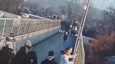 Une femme escalade une clôture et tente de sauter d'un pont, mais un passant qui l'a vue la rattrape au dernier moment par la jambe.