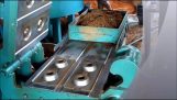 Un travailleur dans un champ de patates douces vide de manière impressionnante les paniers de la récolte dans le seau d'un camion.