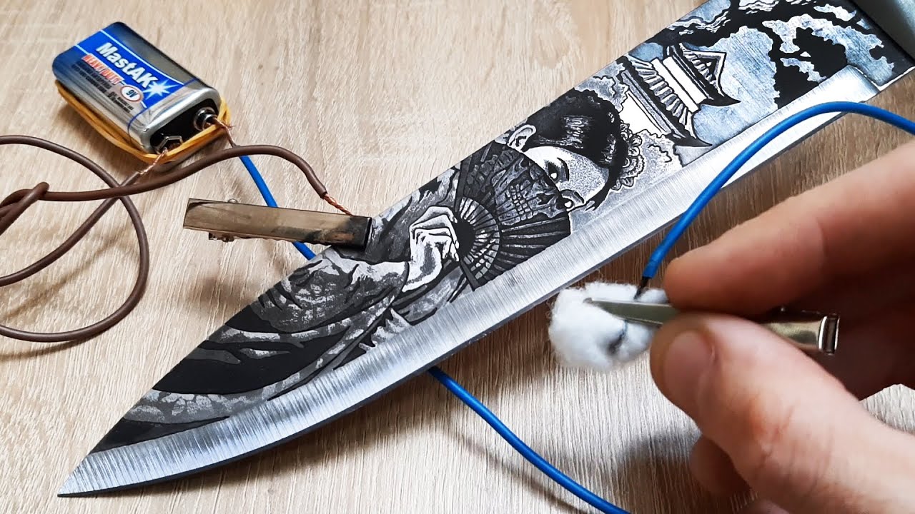 Utilisateur Kirill Runz d'Ukraine, réalise la gravure électrochimique de dessins sur métaux. Il nous montre ici comment il réalise une de ses oeuvres au couteau.