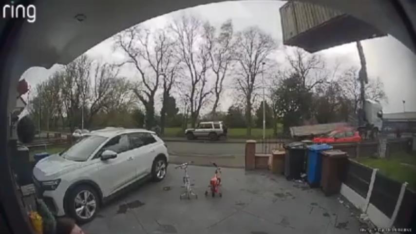 À Manchester, en Angleterre, des vents violents ont fait basculer une grue, et déposer un conteneur sur la façade d'une maison. Une petite fille qui jouait à ce moment-là dans la cour, heureusement, il a été retiré de la scène à temps. La maison a été gravement endommagée et les occupants ont été contraints de la quitter temporairement.