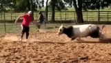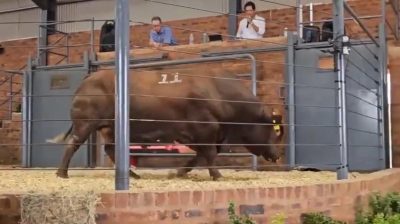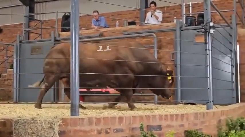 Dans une vente aux enchères de taureaux en Afrique du Sud, Un taureau est sorti de son enceinte pendant le discours du coordinateur et s'est échappé.