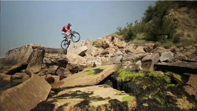 Le cycliste Martyn Ashton prend la moto de valeur 12.000 € fibre de carbone qui a remporté le Tour de France 2012, et atteint la limite de sauts et de cascades dans un environnement amusant moyen.