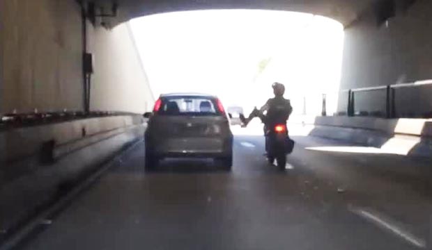 Lorsqu'il quitte un tunnel à Sao Paulo au Brésil, un motocycliste est ennuyé avec un guide qui a précédemment lui donna pas d'espace pour passer. Essayer de lancer la voiture, mais pour sa malchance, il perdra son équilibre.