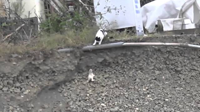 Un chaton essayant de rencontrer sa mère, Situé au sommet d'une pente. Le chat semble petit et semble impuissant. Mais quelle petit chaton va glisser et glisser le bas de la pente, la maman se déroulera pour l'enregistrer et le supprime de rough point.