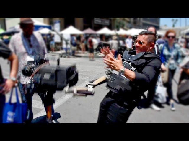 Au cours du rapport Cine Gear Expo à Los Angeles, un homme essaye un stabilisateur de caméra avec une caméra Arri Alexa XT d'une valeur de 70.000 dollars. Surpris par la consolidation fera l’erreur enlever le bras de son corps, qui s’effondrerait du poids de la caméra. Oups!