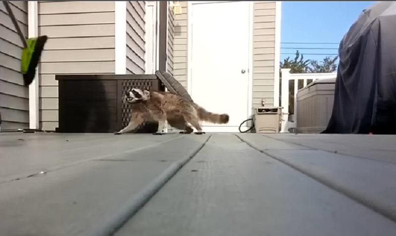 Un homme tente d’expulser un raton laveur qui a été installé avec un petit seau en plastique. Le raton laveur de maman est très protectrice avec ses oursons et vont attaquer l’homme avec le balai.