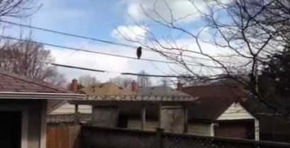 Un raton laveur sur le bord comme un pro sur câbles téléphoniques.
