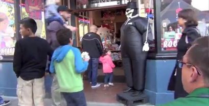 Les farceurs Rich Ferguson utilise un costume gonflable et un masque pour effrayer les passants à l'entrée d'un magasin.