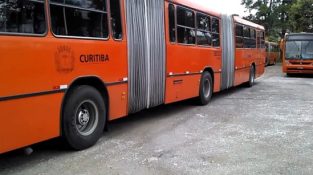 Garer un bus avec triple inverse, dans la ville de Curitiba, Brésil.