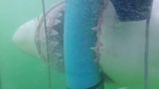 Dans les eaux de Mossel Bay à n. Afrique, les plongeurs qui regardent la vie marine quand une grande attaque de requin blanc de 4 mètres de leur cage. On voit les dents effrayantes du requin mordre ses rails [...]