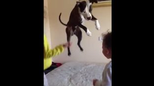 Deux jeunes filles s'amuser en sautant sur un matelas, et encouragera le Pitbull la locomotive pour faire la même chose. La locomotive va sauter sur le matelas en imitant les mouvements de l'enfant.