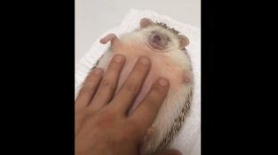Comme elle repose à plat sur une serviette, un hérisson apprécie massage sur l'abdomen par un homme. Un petit moment de détente.