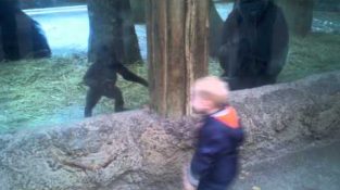 Un garçon s'exécute d'un côté d'un pôle à l'autre, le gorille de bébé suit costume sur l'otherside du verre.