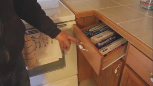 Un homme corrige un tiroir cassé dans la cuisine, qui ne peut être entièrement ouvert.
