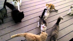 11 chats en attente avec impatience de manger de leur propriétaire, dans une ferme. Le propriétaire est un agriculteur et utilise des chats d'être exemptés de rongeurs, Il dit que cela se produit tous les jours [...]
