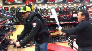 Le vendeur d'un magasin de motos et de scooters dans la ville de Laval, France, faire un spectacle de moto airbag Helite tortue, à un client. Pour prouver la grande robustesse et de protection qui peut être [...]