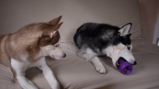 Comme c'est le cas avec de jeunes enfants, Ces deux Huskies ont une intense bataille pour leurs jeux.