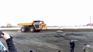 Le Belaz 75710, le plus grand camion du monde, passe au-dessus d'une voiture. Le score; La voiture devient complètement plat, comme une crêpe. Le Belaz est une société de Belarus, qui fabrique des équipements miniers. [...]